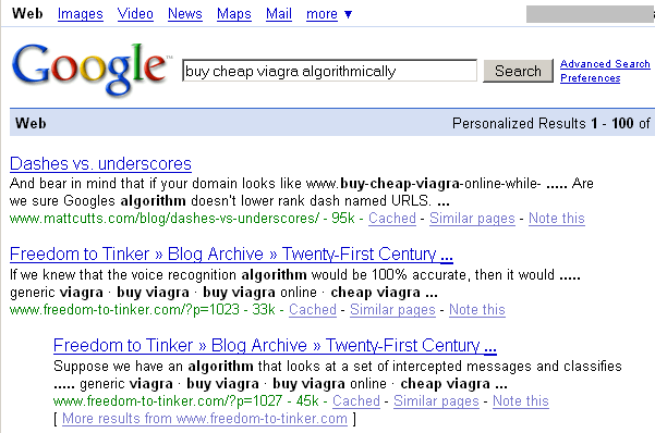Update a few hours later: Matt ranks #1 for [buy cheap viagra algorithmically]:
